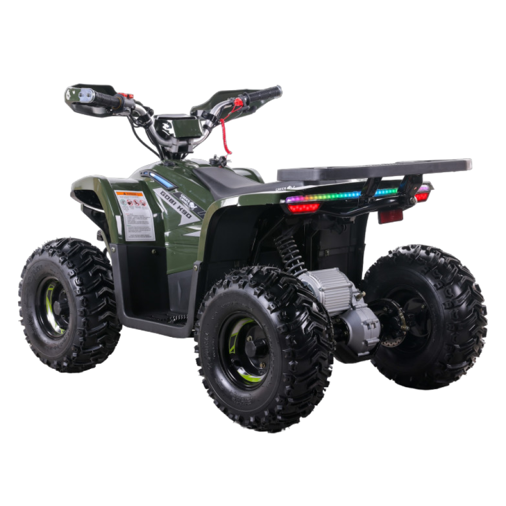 Электроквадроцикл GreenCamel Гоби K90 (48V 750W R7 Дифференциал) Tao LUX Зеленый - это великолепный выбор для молодых авантюристов в возрасте от 5 до 10 лет. С мощностью в 750 Ватт, этот квадроцикл способен развивать скорость до 35 км/ч, предоставляя вашему ребенку незабываемые моменты радости и веселья.