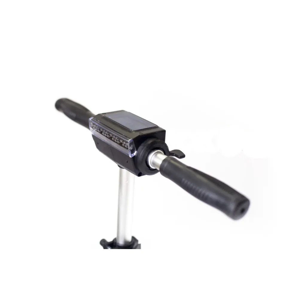 На электросамокате регулируется руль по высоте, при этом размеры самоката значительно уменьшаются. Самокат имеет два фонаря, которые расположены спереди и сзади. На ручке электросамоката имеется дисплей, который отображает всю важную информацию для его владельца.
