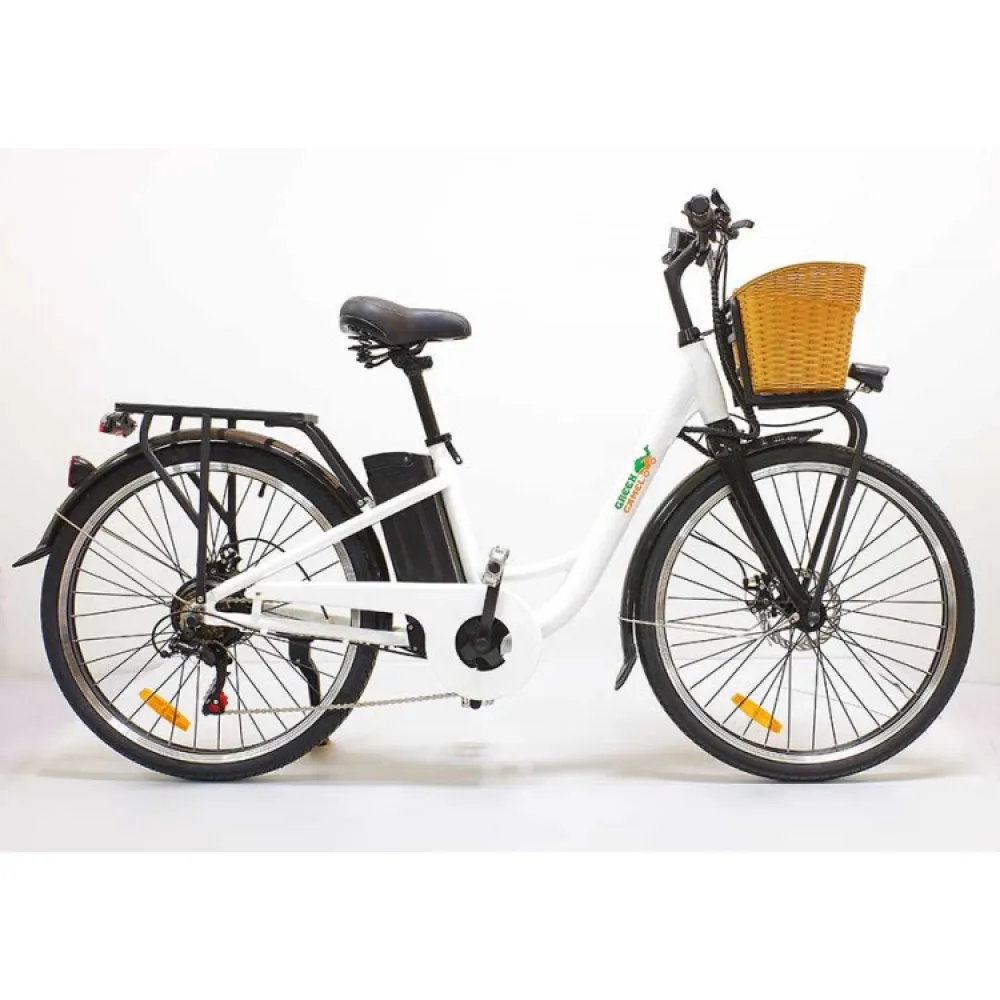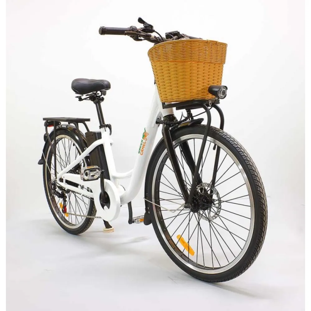 Электровелосипед GreenCamel Бриз (R26 350W 36V 10Ah) Алюм, 6скор – облегченная модель техники весов 22 кг и грузоподъемностью в 110 кг стала хитом продаж наступившего сезона. Первое ознакомление с моделью заявляет, что она создана для слабого пола. Объемная удобная для продуктов корзина, классический белый тон привлекают любителе комфорта и удобства. На самом деле электровелосипед рассчитан на женскую и мужскую категорию. Подтверждением тому являются совершенствованные технические характеристики.